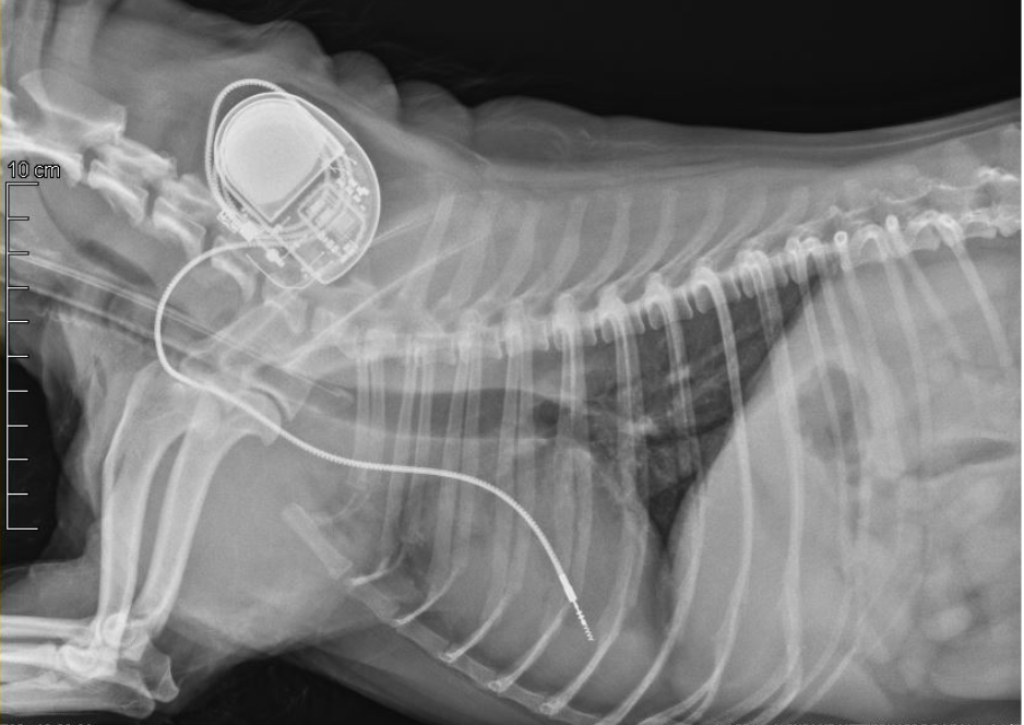 Un pacemaker est un dispositif assimilable à une pile placée sous la peau de l’animal, et qui vient remplacer la fonction électrique cardiaque lorsque celle-ci est défaillante.